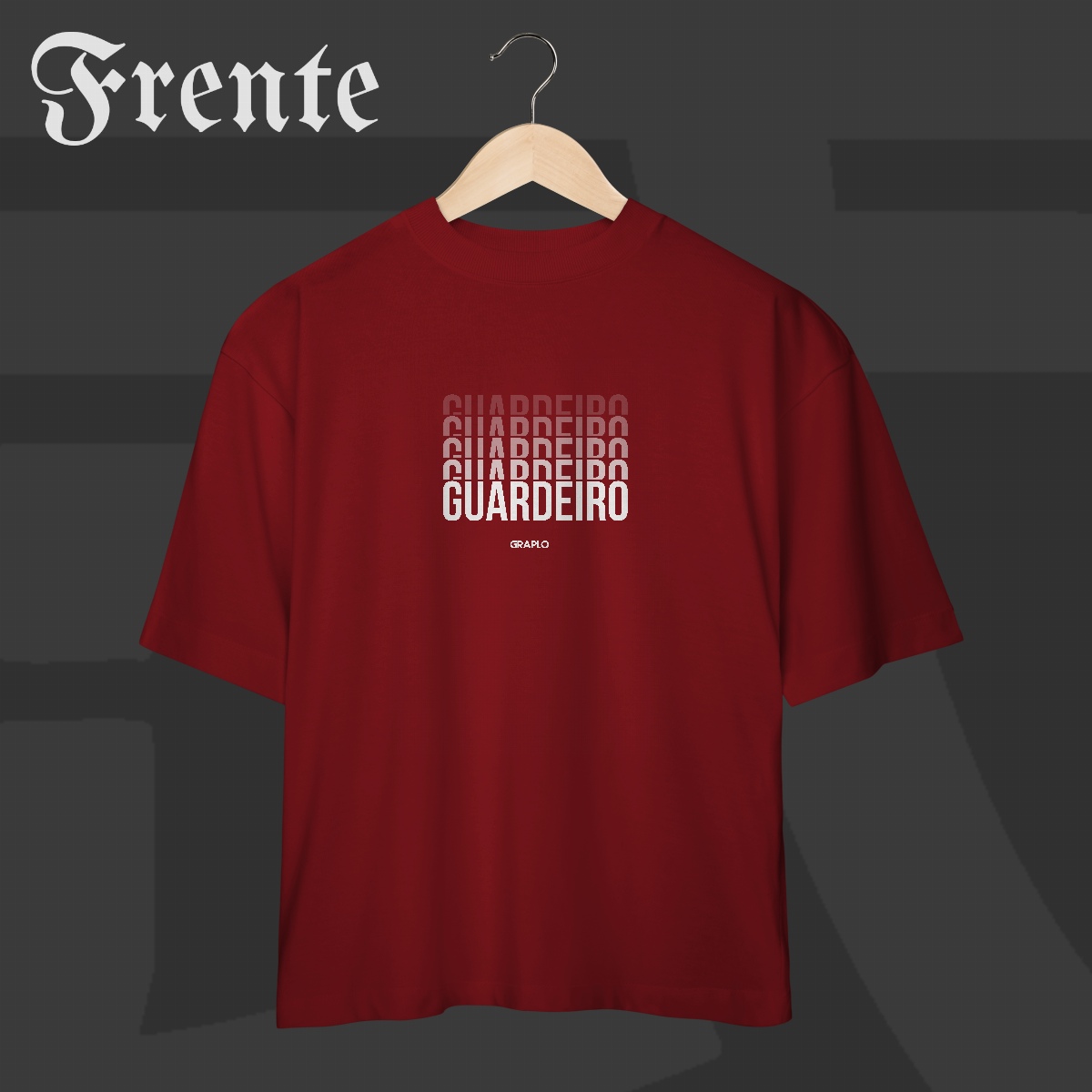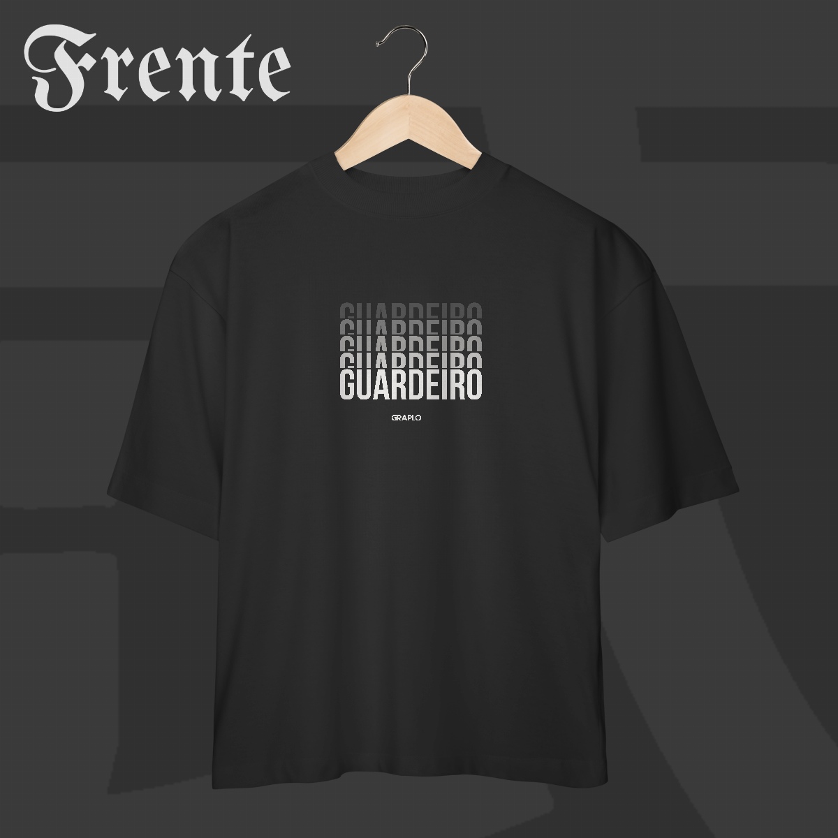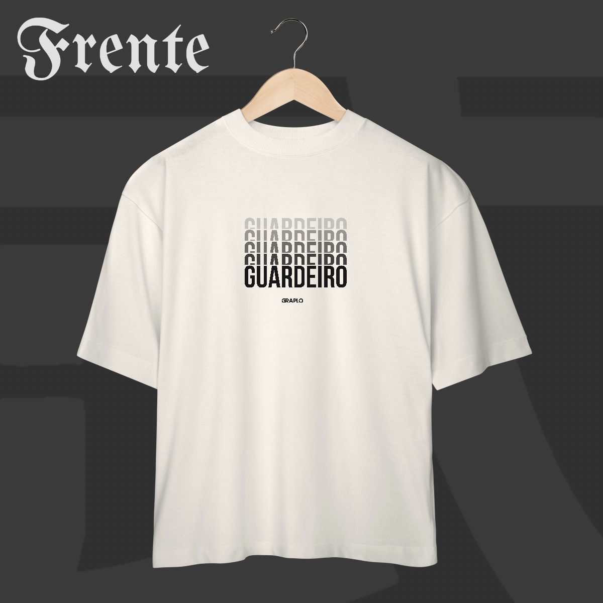 A estampa “GUARDEIRO” traz uma composição tipográfica em degradê, representando camadas de defesa, estratégia e criatividade que só quem guarda sabe aplicar.