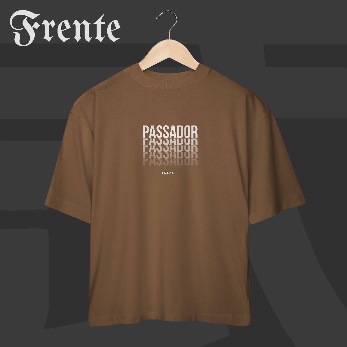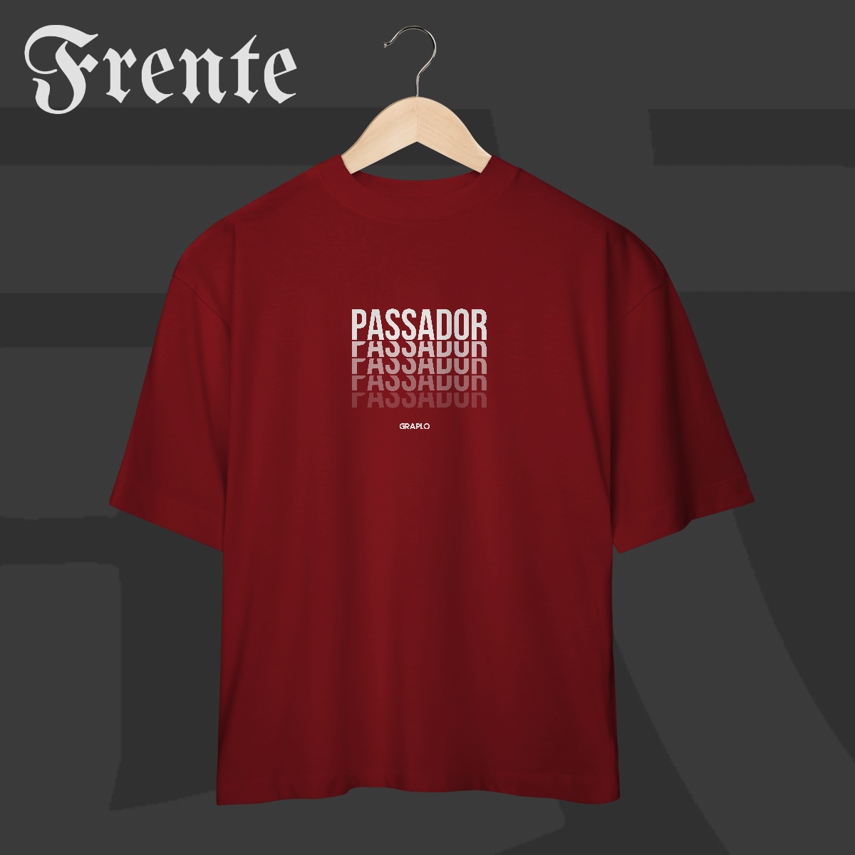 A estampa “PASSADOR” traz um visual moderno com repetição degradê tipográfica, representando o avanço constante e a presença dominante de quem não deixa espaço pro oponente respirar.