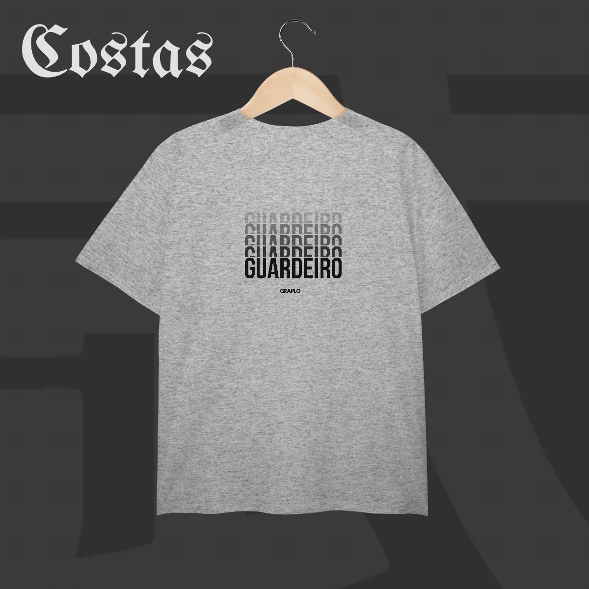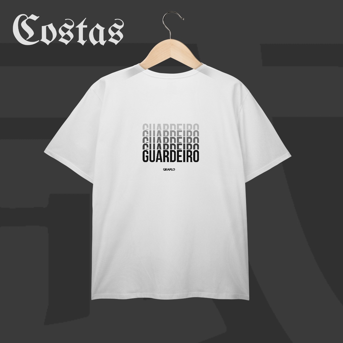 A estampa “GUARDEIRO” traz uma composição tipográfica em degradê, representando camadas de defesa, estratégia e criatividade que só quem guarda sabe aplicar.