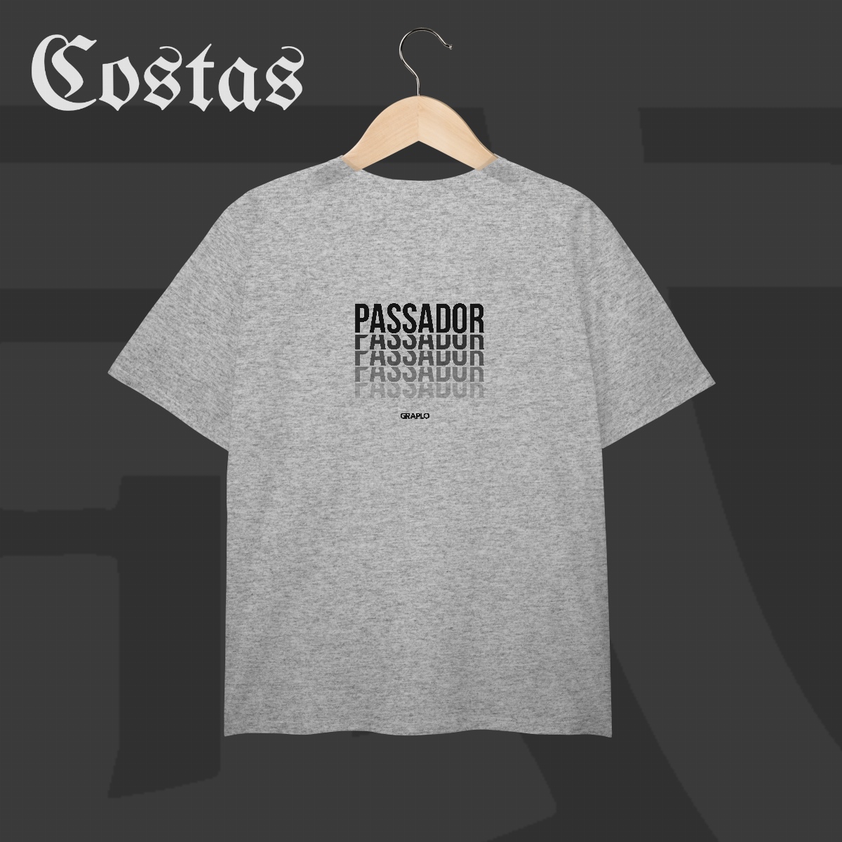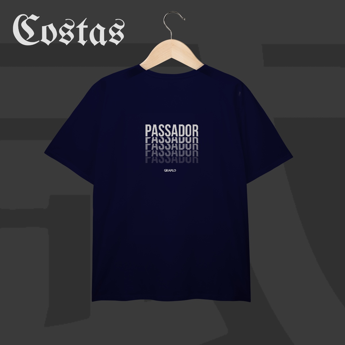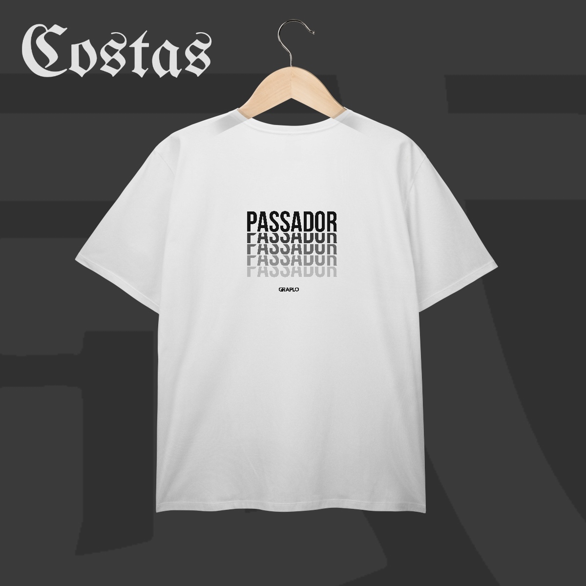 A estampa “PASSADOR” traz um visual moderno com repetição degradê tipográfica, representando o avanço constante e a presença dominante de quem não deixa espaço pro oponente respirar.
