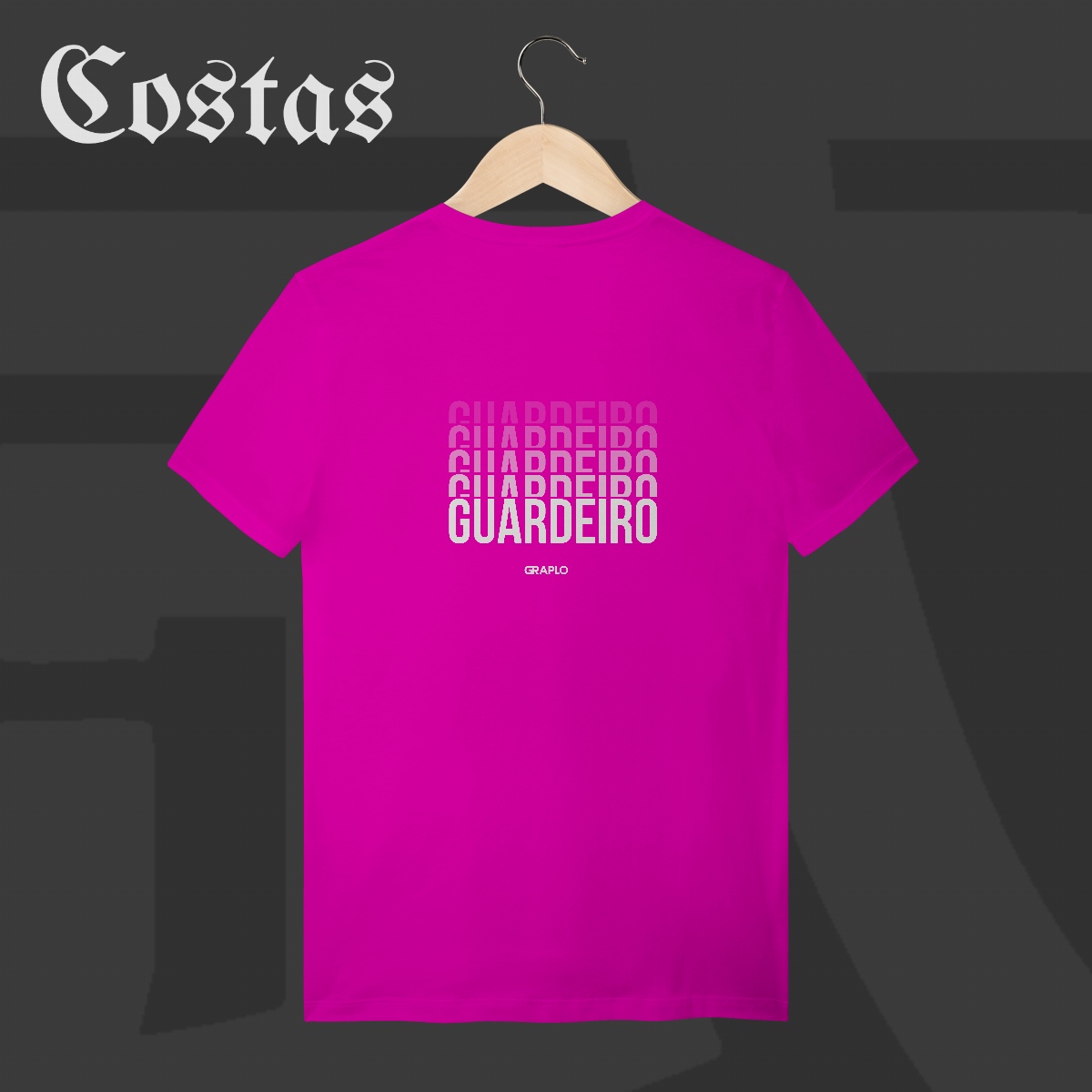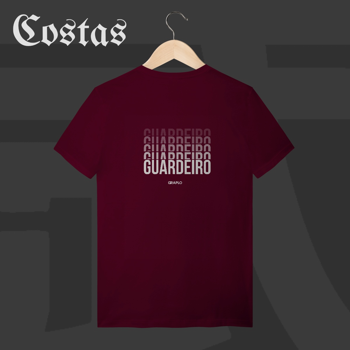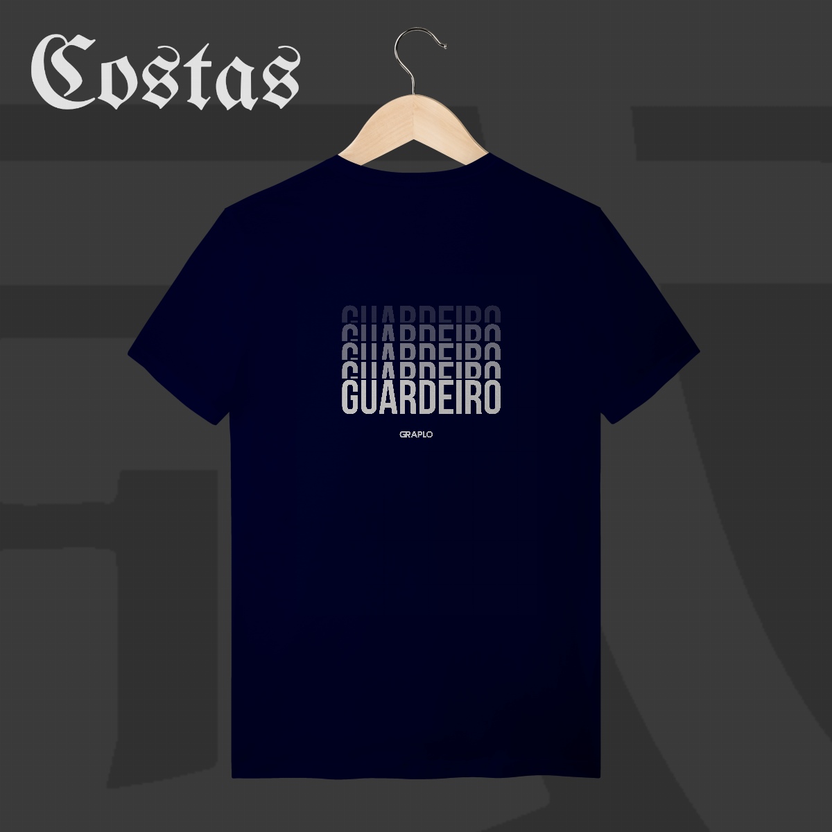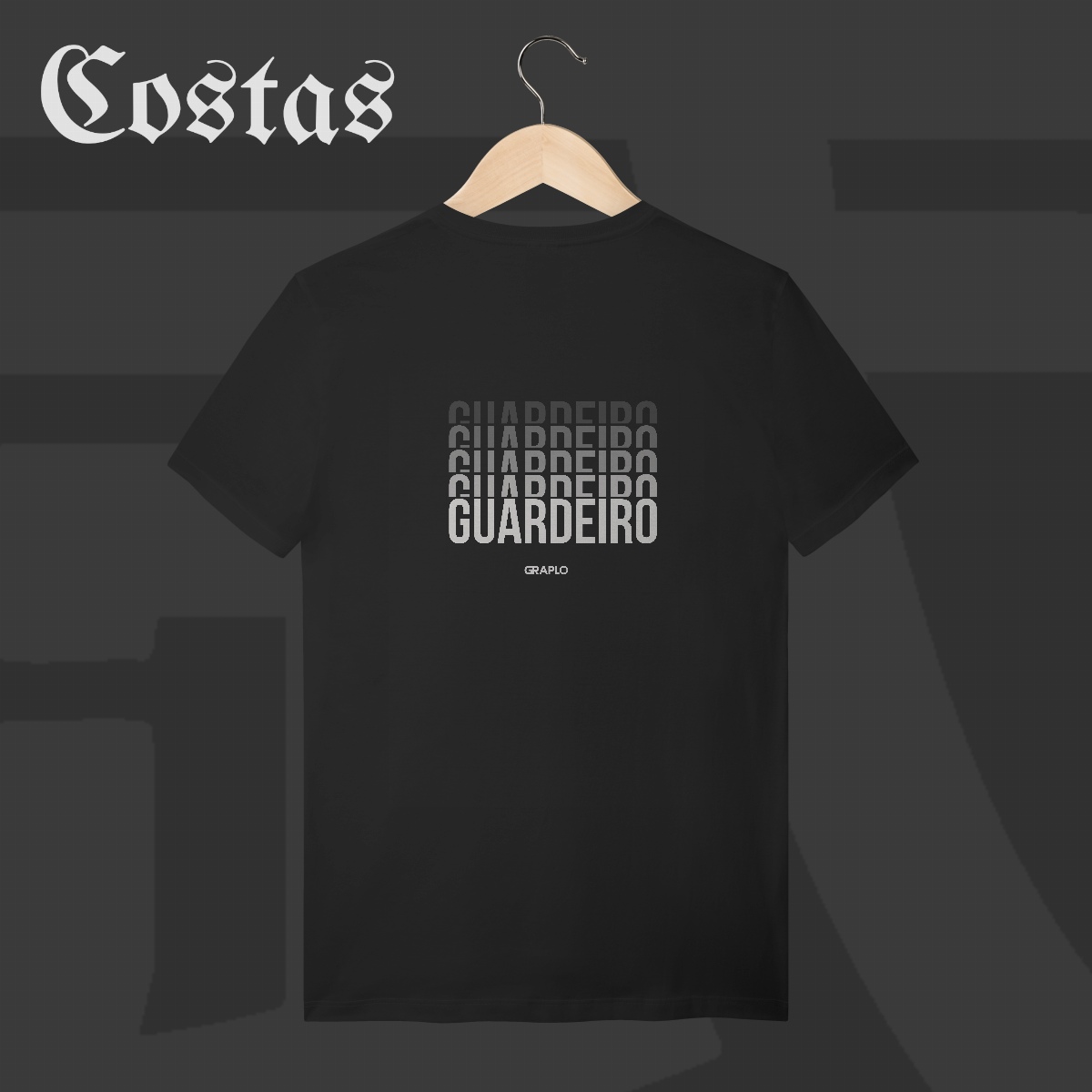 A estampa “GUARDEIRO” traz uma composição tipográfica em degradê, representando camadas de defesa, estratégia e criatividade que só quem guarda sabe aplicar.