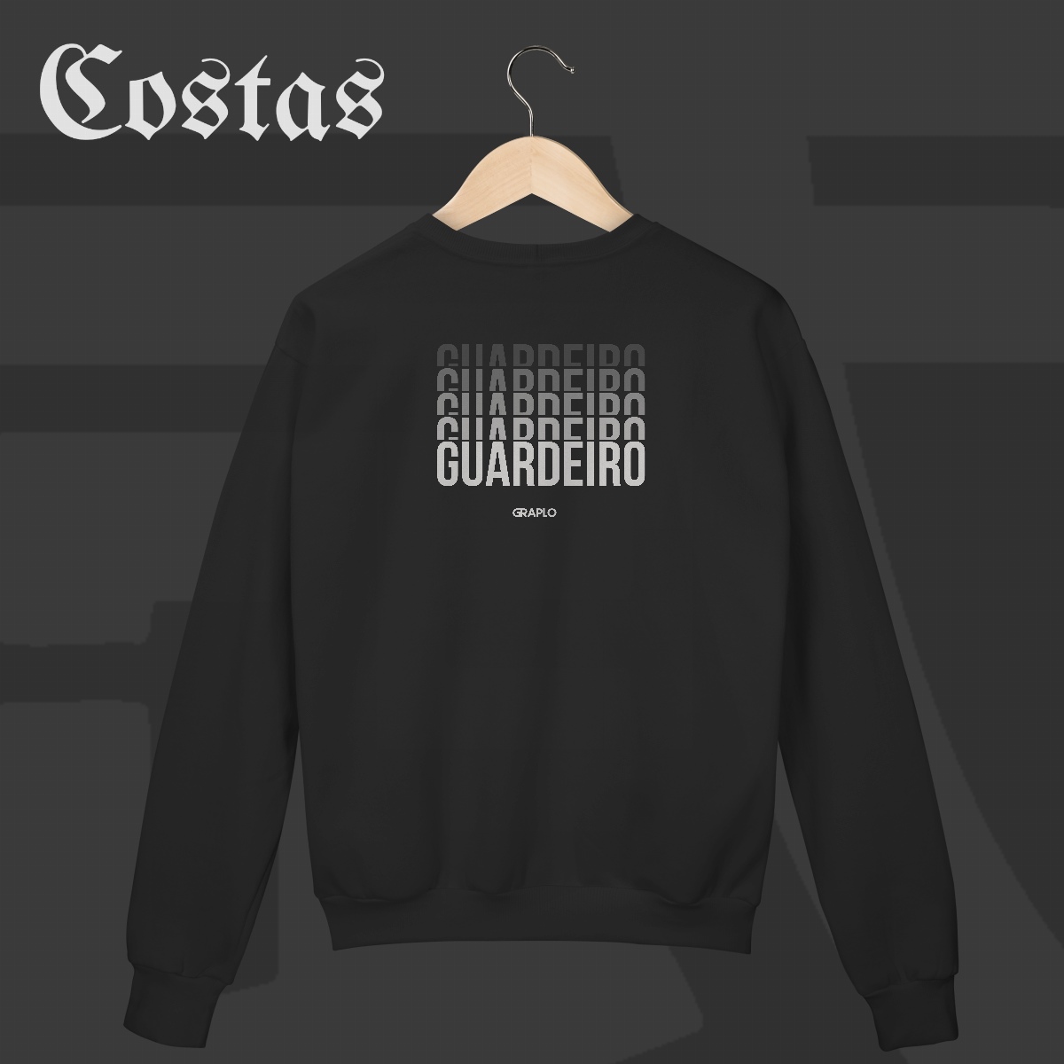 A estampa “GUARDEIRO” traz uma composição tipográfica em degradê, representando camadas de defesa, estratégia e criatividade que só quem guarda sabe aplicar.