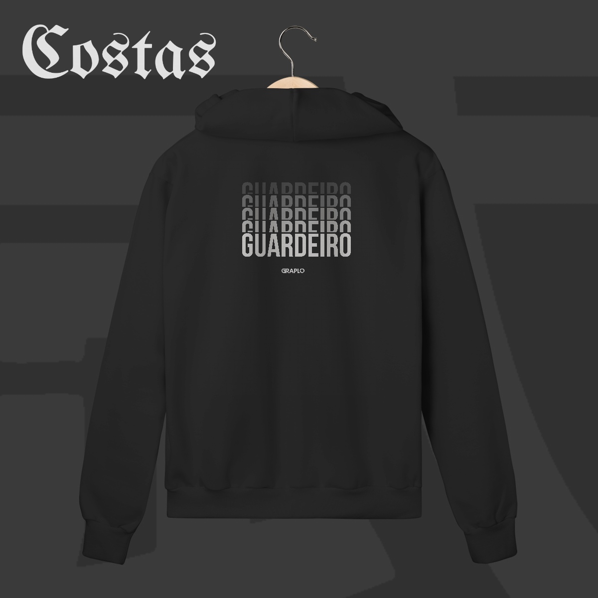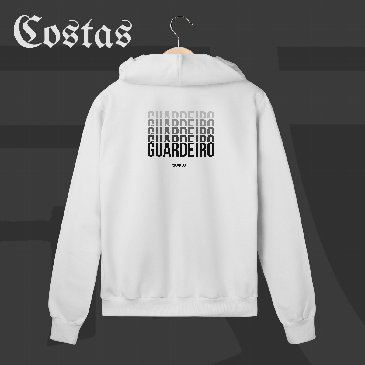A estampa “GUARDEIRO” traz uma composição tipográfica em degradê, representando camadas de defesa, estratégia e criatividade que só quem guarda sabe aplicar.
