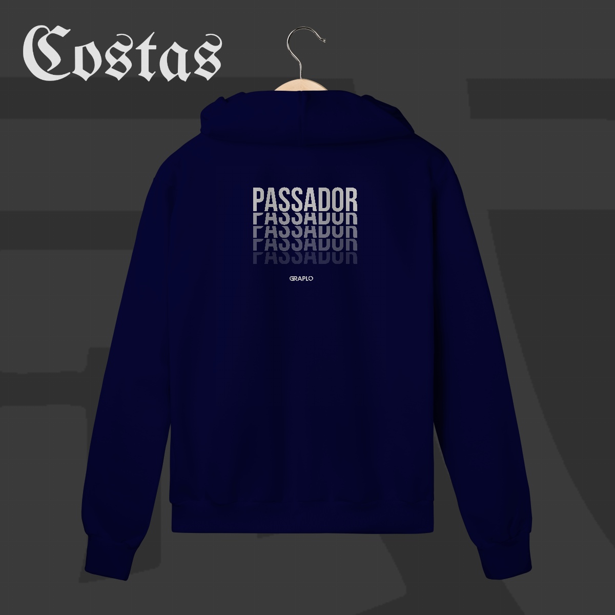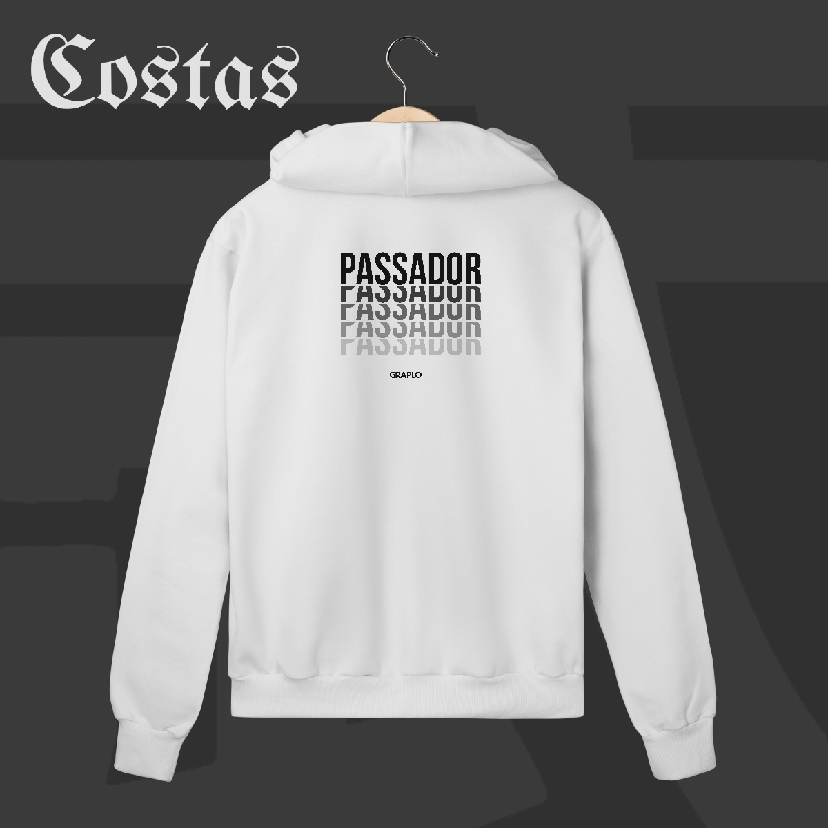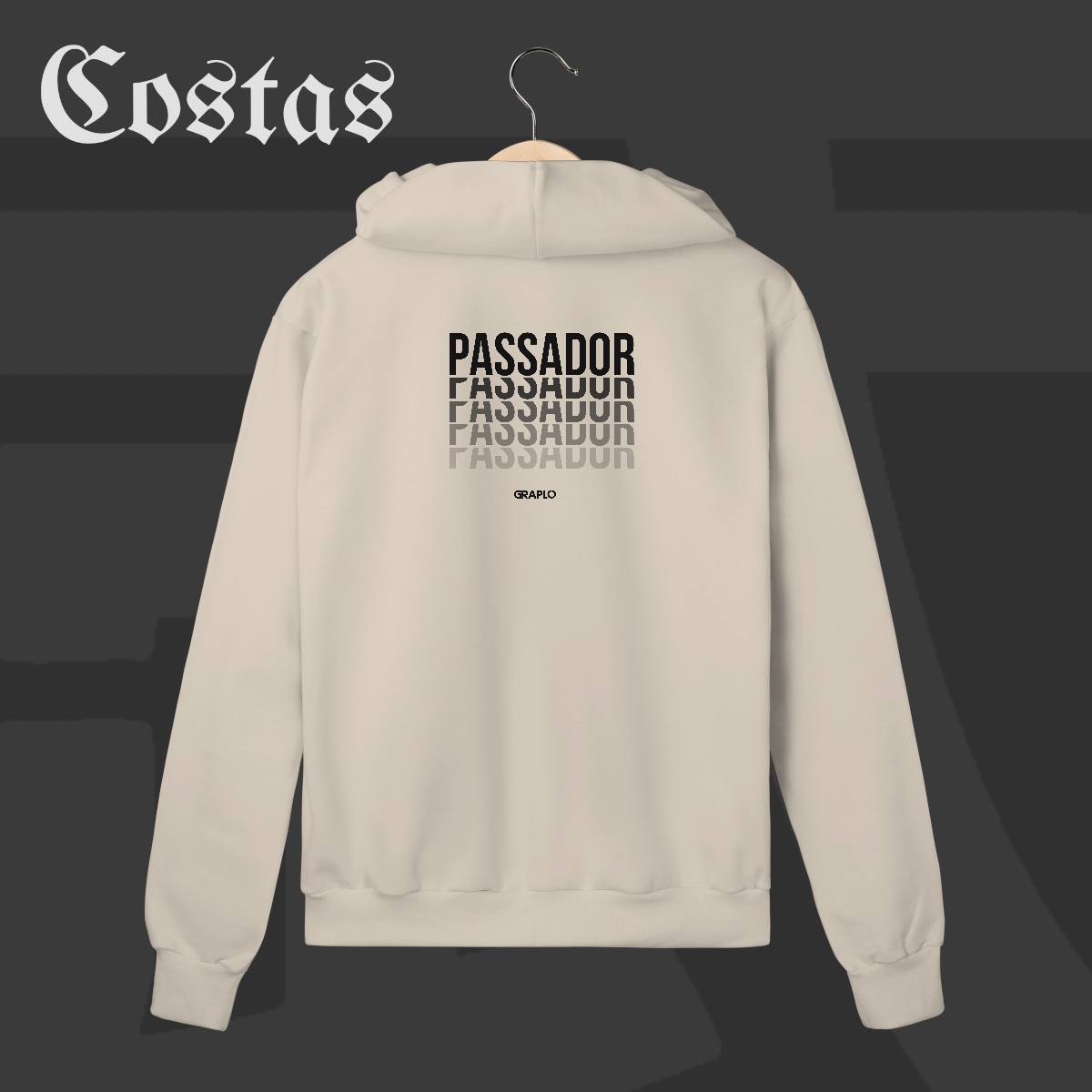 A estampa “PASSADOR” traz um visual moderno com repetição degradê tipográfica, representando o avanço constante e a presença dominante de quem não deixa espaço pro oponente respirar.